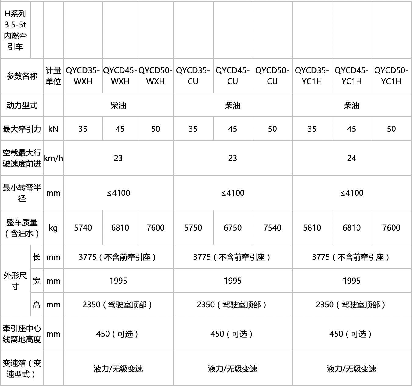 H系列3.5-5噸內(nèi)燃牽引車主要適用于港口、冶金、船舶和機(jī)車制造等各類平面運(yùn)輸物流場所的牽引作業(yè)和推頂作業(yè)。該系列牽引車變矩器、驅(qū)動(dòng)橋等核心部件性能優(yōu),可靠性較高,選用國內(nèi)外知名品牌的柴油發(fā)動(dòng)機(jī),其功率儲備大,噪音低,環(huán)保性能好, 可靠性高;變速箱選用本公司自主研制的高性能變速箱,經(jīng)過優(yōu)化設(shè)計(jì)的傳動(dòng)系統(tǒng)與發(fā)動(dòng)機(jī)的動(dòng)力輸出達(dá)到理想匹配。該系列牽引車轉(zhuǎn)向輕便、準(zhǔn)確,可有效避免輪胎過早磨損,前橋早期報(bào)廢等問題的發(fā)生。